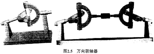 萬(wàn)向聯(lián)軸器可分為單萬(wàn)向聯(lián)軸器和雙萬(wàn)向聯(lián)軸器,用于聯(lián)接軸線相交的兩軸,以傳遞轉(zhuǎn)動(dòng)和扭矩,能夠保證在兩軸軸線夾角在35°到45°發(fā)生變化時(shí),保證所聯(lián)接的兩軸連續(xù)回轉(zhuǎn),可靠地傳遞扭矩。這種聯(lián)軸器主要由兩個(gè)安裝在主,從動(dòng)軸軸端上的叉形接頭(單叉),中間聯(lián)接件(十字塊),塞銷(xiāo)和銷(xiāo)桿組成,結(jié)構(gòu)如圖2.5。