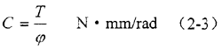 扭轉剛度以產生單位扭轉變形所需的扭矩表示。通常,由于傳動軸系中其他零件的剛度都比彈性聯軸器的剛度大得多,所以,為了簡化起見,其他零件的彈性可以略去不計,僅考慮聯軸器的彈性,并根據這一情況以聯軸器的剛度作為傳動軸系的剛度。剛度可用下式表示: