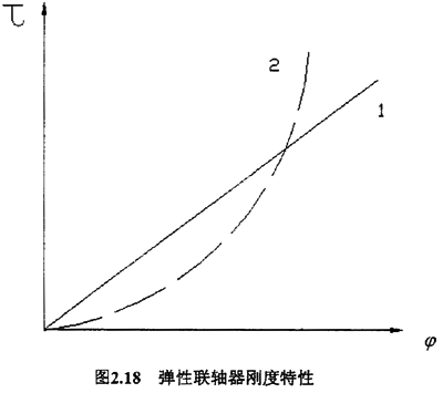 常用的彈性聯軸器的扭轉剛度為常量,稱為等剛度聯軸器,即兩半聯軸器相對扭轉角隨扭矩的增大而線性增大,如下圖2.18中的曲線l為等剛度彈性聯軸器的扭矩和轉角之間的關系。彈性聯軸器的剛度也可以是變化的,稱為變剛度聯軸器,也就是非線性剛度。如下圖曲線2所示。變剛度彈性聯軸器適用于有強烈振動的轉軸系,當軸系接近發(fā)生共振時,剛度隨扭矩的增大而增大,改變轉動軸系固有頻率和振動頻率之間的關系,就能避開共振。