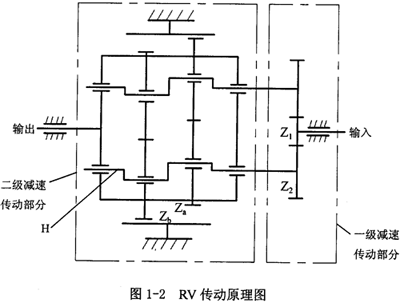 在K-H-V型行星齒輪傳動(dòng)基礎(chǔ)上,發(fā)展起來(lái)的RV傳動(dòng)和雙曲柄式少齒差行星傳動(dòng)機(jī)構(gòu)在工程上得到了較好地應(yīng)用。圖1-2所示為RV傳動(dòng)原理圖。