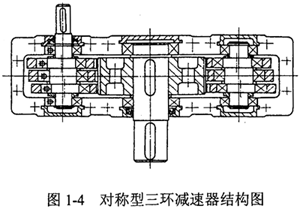 盡管我國(guó)在三環(huán)減速器的研究方面取得了許多令人矚目的成果,但由于三環(huán)減速器的研發(fā)時(shí)間較短,對(duì)有些問(wèn)題研究的還不夠深入,生產(chǎn)中存在的一些實(shí)際問(wèn)題還未從根本上得到解決,制約了這種新裝置的推廣使用。我國(guó)開發(fā)的三環(huán)減速器的基本型結(jié)構(gòu)主要有兩種,一是兩高速軸對(duì)稱布置于輸出軸兩側(cè)的對(duì)稱型三環(huán)減速器,如圖1-4所示,另一種是兩高速軸布置于輸出軸同側(cè)的偏置型三環(huán)減速器。