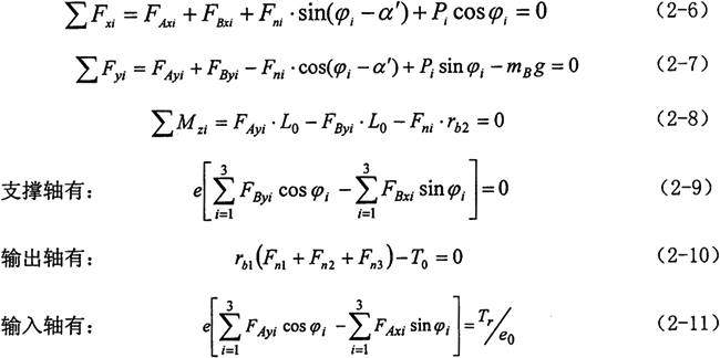 由上式可看出,任意時(shí)刻各環(huán)板上作用的嚙合力是不相等的,且是與轉(zhuǎn)角、環(huán)板和曲柄軸結(jié)構(gòu)尺寸、壓力角以及偏心尺寸有關(guān)的復(fù)雜函數(shù),假設(shè)各嚙合力相等或者是成一簡單的函數(shù)關(guān)系都是與實(shí)際嚴(yán)格不符的。若需要用簡潔的函數(shù)關(guān)系加以描述,應(yīng)首先利用上式求出輸出軸旋轉(zhuǎn)一周時(shí)的數(shù)個嚙合力的表達(dá)式,這里不作詳細(xì)的討論。