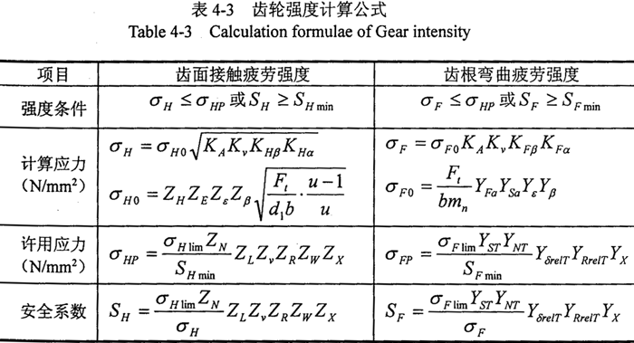 筆者設計的兩級三環(huán)傳動部分的內齒環(huán)板和輸出外齒輪的材料均為45號鋼,并進行調質處理,內齒環(huán)板工作齒面HB260,取σFlim=320MPa,σHlim=700MPa;外齒輪工作齒面HB240,取σFlim=290MPa,σHlim=690MPa。根據表4-3所示的輪齒齒面接觸疲勞強度和齒根彎曲疲勞強度計算公式可進行三環(huán)傳動的強度驗算。