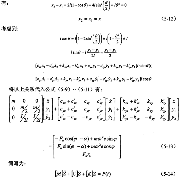 由第三章的分析知,油膜力是復(fù)雜的非周期性函數(shù),考慮到軸徑的振幅很小,對油膜力作線性化處理(所得函數(shù)仍含有耦合項),由于油膜剛度較轉(zhuǎn)臂軸承和偏心軸的剛度小的多,這里僅考慮油膜的影響,應(yīng)用牛頓第二定律可列出該環(huán)板的運動微分方程(先不考慮環(huán)板的標(biāo)號)。