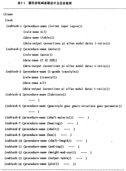 圓柱齒輪減速器的設(shè)計(jì)過程通過仔細(xì)的分析并進(jìn)行歸納,則具有明顯的階段性,可表示為一系列的設(shè)計(jì)任務(wù)的鏈?zhǔn)叫蛄。如設(shè)計(jì)任務(wù)描述的輸入過程,原動(dòng)機(jī)械的選擇和確定過程,傳動(dòng)級(jí)數(shù)和傳動(dòng)形式的選擇和確定過程。潤滑方式的選擇和確定過程,齒輪傳動(dòng)參數(shù)和齒輪結(jié)構(gòu)的選擇和計(jì)算過程;……。其中每一個(gè)設(shè)計(jì)過程都將設(shè)計(jì)結(jié)果傳遞給后繼設(shè)計(jì)過程。對(duì)設(shè)計(jì)任務(wù)進(jìn)行這樣的分階段描述,使整個(gè)設(shè)計(jì)過程和設(shè)計(jì)任務(wù)間的接口形式的描述大大的簡化了。與設(shè)計(jì)過程的分階段描述相對(duì)應(yīng),對(duì)系統(tǒng)的產(chǎn)生式知識(shí)進(jìn)行分類,將與一設(shè)計(jì)階段任務(wù)相關(guān)的產(chǎn)生式知識(shí)歸結(jié)在一起,形成對(duì)應(yīng)于該階段設(shè)計(jì)任務(wù)的產(chǎn)生式知識(shí)元。同時(shí),對(duì)較通用的產(chǎn)生式知識(shí)形成通用規(guī)則知識(shí)元。在此基礎(chǔ)上,系統(tǒng)通過不同的設(shè)計(jì)階段調(diào)度相應(yīng)的知識(shí)元,并與通用知識(shí)元一起動(dòng)態(tài)形成設(shè)計(jì)過程的產(chǎn)生式規(guī)則庫,從而,形成設(shè)計(jì)過程產(chǎn)生式知識(shí)的調(diào)用。這樣作具有: