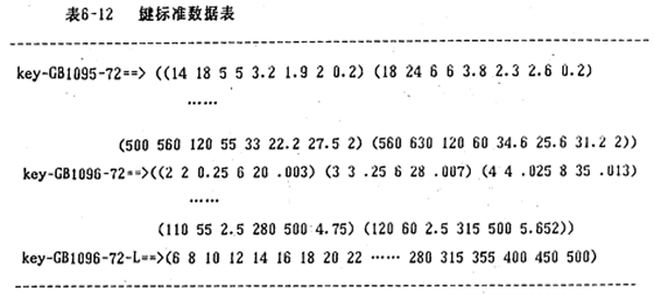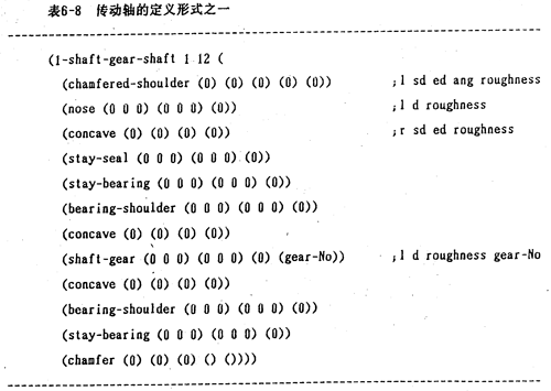 軸的結(jié)構(gòu)通常為階梯軸,階梯的級數(shù)以及各階梯的直徑和長度,應(yīng)綜合考慮軸上零件和裝配固定形式,軸的加工工藝性等因素進(jìn)行設(shè)計(jì),階梯數(shù)以易于安裝,同時(shí)減少加工次數(shù)為主要原則。通過大量統(tǒng)計(jì)分析分類,系統(tǒng)采用七種軸的結(jié)構(gòu)形式,分別用框架表示。表6-8其中一類軸的定義形式。其中,表中主要內(nèi)容:12為段數(shù),chatnfered-shoulder、…,nose、…分別為軸段特性、尺寸、加工特性等,第九行中的shaft-gear為連軸式齒輪,最后一列的gear-No為該齒輪的編號,可以作為索引查詢到該齒輪的參數(shù)。在確定尺寸時(shí),某類軸的形式有時(shí)會發(fā)生變化。例如,階梯軸某一段長度為零時(shí),這一階梯軸段便在設(shè)計(jì)圖紙上消失。
