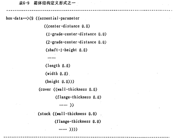 在進(jìn)行圖1-1、圖1-2-1、l-2-2、1-2-3種類的圓柱齒輪減速器設(shè)計(jì)時(shí),箱體是種類最多,變化程度最大的部件,因此,不可能建立一種統(tǒng)一的模式。根據(jù)傳動方案的不同,箱體形狀會發(fā)生很大的變化,設(shè)計(jì)工作量極繁重。通過分析,本系統(tǒng)采用的方法是通過框架來表達(dá)箱體設(shè)計(jì)的大量知識,如表6-11所示的框架是圖1-2-2 中第9號箱體的結(jié)構(gòu)定義式。