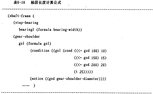 箱體結(jié)構(gòu)及尺寸設(shè)計(jì)完成后,便可進(jìn)行傳動軸結(jié)構(gòu)參數(shù)長度的設(shè)計(jì)計(jì)算。軸的各段長度,決定于軸上零件的寬度,零件間的相對位置,傳動布置,箱體尺寸以及安裝要求等。傳統(tǒng)的設(shè)計(jì)方法是根據(jù)草圖進(jìn)行設(shè)計(jì),專家系統(tǒng)則要求精確的數(shù)值計(jì)算。軸段長度的計(jì)算是通過其知識框架和嵌套在框架中的過程知識進(jìn)行,如表6-10所示。過程知識主要用于非規(guī)律性知識的求值。在計(jì)算時(shí),§6.8中定義的軸的結(jié)構(gòu)有時(shí)會發(fā)生變化,這主要表現(xiàn)在
