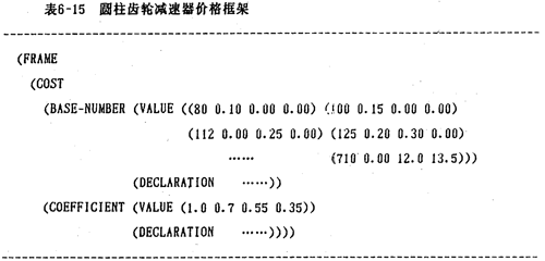1.圓柱齒輪減速器價(jià)格主要考慮齒輪材料、精度,減速器中心距,總重量等因素,如表6-14。專家系統(tǒng)設(shè)計(jì)中,可用框架表示(表6-15 ):