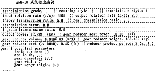 圓柱齒輪減速器設(shè)計(jì)完成后,其結(jié)果為一系列表(LISP 語言形式)組成的結(jié)果。為了使專家系統(tǒng)的結(jié)果方便地被用戶所理解,系統(tǒng)設(shè)置有相應(yīng)的輸出函數(shù),并以表格的形式,輸出所需的設(shè)計(jì)數(shù)據(jù)。下表(表6-16)為專家系統(tǒng)設(shè)計(jì)的一一級圓柱齒輪減速器的示例。