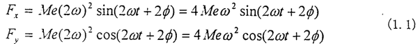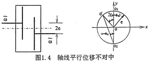 不對中具有一些典型的特征,如不對中比較嚴(yán)重時會使軸承的油膜壓力偏離正常值,聯(lián)軸器不對中時聯(lián)軸器兩端軸承的振動較大,軸心位置不穩(wěn)定,而且在振動頻譜中二倍頻分量幅值較大等。而對于齒輪聯(lián)軸器不對中產(chǎn)生倍頻振動分量的機理研究又是其中的一個重點。文獻[68]指出,由于安裝時轉(zhuǎn)子軸心線不對中引起的振動,在用電機驅(qū)動的轉(zhuǎn)子系統(tǒng)中,當(dāng)電機軸與負載機械由齒輪聯(lián)軸器連接時,電機軸存在二倍頻的振動,而在單獨運動時,倍頻振動立即消失,這表明倍頻振動完全是齒輪聯(lián)軸器耦合的結(jié)果。文獻[64,65]解釋了由于齒輪聯(lián)軸器不對勁中而產(chǎn)生二倍頻振動的機理,以[65]中的軸線平行位移不對中為例見圖1.4,圖中ω為轉(zhuǎn)子的轉(zhuǎn)動的解速度,2e為不對中量,M為內(nèi)齒套的質(zhì)量,φ0為起始回轉(zhuǎn)角。