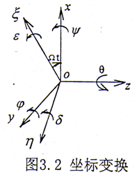 設(shè)將整個(gè)軸承—轉(zhuǎn)子—齒輪聯(lián)軸器系統(tǒng)劃分成n個(gè)軸段和n個(gè)結(jié)點(diǎn),在第j個(gè)結(jié)點(diǎn)處存在一個(gè)半齒輪聯(lián)軸器系統(tǒng),如圖3.1所示。將外齒輪和內(nèi)齒套均看作一當(dāng)量圓盤,并滿足小擾動(dòng)假設(shè),不計(jì)軸向運(yùn)動(dòng),則圓盤的運(yùn)動(dòng)可用其中心的位移(xj,yj)和相應(yīng)的偏轉(zhuǎn)角(φj,ψj,θj)來表示,其中三個(gè)偏轉(zhuǎn)角的意義見圖3.2。設(shè)oxyz為固定坐標(biāo)系,oξηz為相應(yīng)的旋轉(zhuǎn)坐標(biāo)系,下面就以此為模型用拉格朗日方程來建立該子系統(tǒng)的運(yùn)動(dòng)微分方程。