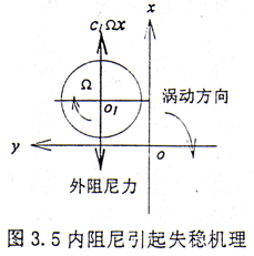 對于式(3.20)的穩(wěn)定性分析要復(fù)雜得多,形如式(3.14)的耗散函數(shù)首見于文獻(xiàn)[92]。美國學(xué)者Kane等在研究耗散的重力定向自旋衛(wèi)星穩(wěn)定性時(shí)發(fā)現(xiàn)的,與之相關(guān)的力被后來的學(xué)者稱之為約束阻尼,并沿用至今,而在轉(zhuǎn)子動(dòng)力學(xué)中則多被稱為循環(huán)力[93].如果在系統(tǒng)運(yùn)動(dòng)方程中沒有循環(huán)力陣[S],則系統(tǒng)的穩(wěn)定性可以利用著名的Kelvin-Tait-Chetaev定理來分析,但是當(dāng)[S]≠0時(shí),這個(gè)定理就不適用了。Mingori[94]、李俊峰等[95]對此作了專門的研究,給出了在某些特定條件下的判穩(wěn)方法。文獻(xiàn)[94]仍要求解一同階矩陣的特征值;而文獻(xiàn)[95]中的條件則要求det[G]≠0,因而式(3.20)不滿足,比較可行的方法是運(yùn)用Routh-Hurwitz法來判穩(wěn),但也只能解決低階系統(tǒng),對于高階系統(tǒng)只能進(jìn)行數(shù)值計(jì)算。一個(gè)比較簡單的物理解釋是在式(3.16)和式(3.17)中,存在首促進(jìn)渦動(dòng)的耦合力(clΩx)和耦合力矩(caΩφ)項(xiàng)。下面以耦合力(clΩx)為例來加以說明。設(shè)轉(zhuǎn)子的轉(zhuǎn)動(dòng)方向和渦動(dòng)方向如圖3.5所示,耦合力與軸的轉(zhuǎn)動(dòng)方向相同,并且隨轉(zhuǎn)子轉(zhuǎn)動(dòng)角速度Ω的增大而增大,在Ω高于某一極限值時(shí),這個(gè)耦合力會(huì)超過外阻尼使軸心產(chǎn)生一個(gè)與該力同向的加速度,這個(gè)加速度使軸心軌跡發(fā)散,即系統(tǒng)失穩(wěn)。