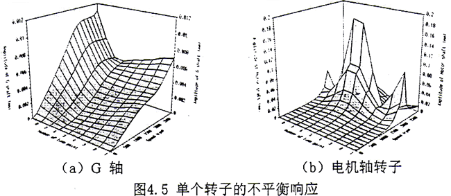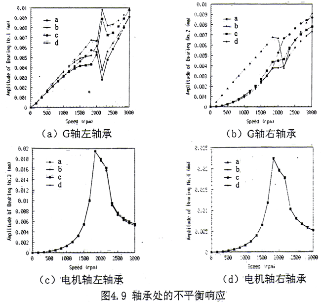 (2)分別在G軸、齒輪聯(lián)軸器和電機(jī)軸上存在不平衡量,計(jì)算了耦合系統(tǒng)的不平衡響應(yīng)。計(jì)算結(jié)果見(jiàn)圖4.6a~4.6c。
