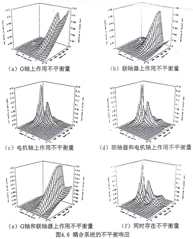 (3)分別在齒輪聯(lián)軸器和電機(jī)軸、G軸和齒輪聯(lián)軸器以及三處同時(shí)存在不平衡量,并設(shè)由此產(chǎn)生不平衡力的作用方向相同,計(jì)算了耦合系統(tǒng)的不平衡響應(yīng)。計(jì)算結(jié)果見(jiàn)圖4.6d~4.6f。