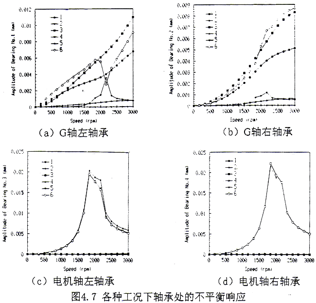 比較圖4.5a和4.6a可見(jiàn),同樣在G軸的大齒輪上存在不平衡量,單軸和耦合系統(tǒng)所產(chǎn)生的響應(yīng)卻有較大的差別。用單個(gè)G軸計(jì)算,從G軸的左端開(kāi)始到右軸承不平衡響應(yīng)幅值變化比較平緩,隨后迅速增大,在外伸端達(dá)到最大值;而用耦合系統(tǒng)來(lái)計(jì)算,則在G軸的左端振幅最大,比用單個(gè)G軸計(jì)算所得值在同一位置高得多,隨后迅速減小,在G軸的右軸承處振幅最小,之后又迅速增大,在外伸端達(dá)到一極值,但比用單個(gè)G軸所得值小,這一特點(diǎn)表明,耦合后G軸外伸端的不平衡響應(yīng)受到一定程度的抑制;從圖4.6b可知,聯(lián)軸器的不平衡量對(duì)本身的振動(dòng)產(chǎn)生較大的影響,對(duì)G軸左右軸承的影響較小,當(dāng)然這與聯(lián)軸器的不平衡量密切相關(guān),如果聯(lián)軸器的不平衡量較大,則另當(dāng)別論;由圖4.6f可見(jiàn),在G軸、聯(lián)軸器和電機(jī)軸上同時(shí)存在不平衡量時(shí),在工作轉(zhuǎn)速下,聯(lián)軸器處的響應(yīng)幅值很大,與圖4.6b相比可知,聯(lián)軸器處的振動(dòng)是G軸、聯(lián)軸器本身和電機(jī)軸三處不平衡力綜合作用的反應(yīng),聯(lián)軸器處振動(dòng)過(guò)大對(duì)其可靠運(yùn)行帶來(lái)不利。另外比較圖4.5和圖4.6可知,電機(jī)軸的不平衡響應(yīng)主要是由電機(jī)軸自身的不平衡造成的,G軸和聯(lián)軸器的不平衡對(duì)其影響很小。從圖4.7可見(jiàn),僅在G軸上作用不平衡力,當(dāng)轉(zhuǎn)速超過(guò)1000(rpm)后,用耦合系統(tǒng)計(jì)算所得G軸軸承上的振幅明顯大于用單個(gè)G軸所得值,而且隨轉(zhuǎn)速增大,變化越明顯。在工作轉(zhuǎn)速下,二軸承處的振幅前者分別是后者的1.60倍和1.66倍,這表明用單個(gè)G軸計(jì)算G軸二側(cè)軸承的不平衡響應(yīng)是不安全的,而且實(shí)際測(cè)量[18]的結(jié)果確實(shí)要比計(jì)算所得的值要大得多。另外,在軸承處的不平衡響應(yīng),只要是用耦合系統(tǒng)進(jìn)行計(jì)算,那么在非共振區(qū)各轉(zhuǎn)子的不平衡只對(duì)本身所所在二個(gè)軸承的振幅起決定作用,而對(duì)另二個(gè)軸承影響不大。這反映了在一般情況下,一側(cè)轉(zhuǎn)子的不平衡所引起的振動(dòng)通過(guò)聯(lián)軸器而傳遞到另一側(cè)的振動(dòng)較小,這也正是齒輪聯(lián)軸器被廣泛采用的另一個(gè)優(yōu)點(diǎn)。
