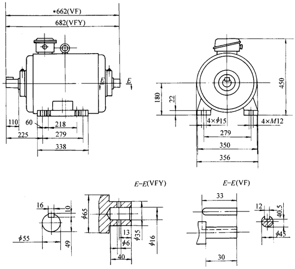 VF系列及其派生系列電動機(jī)的電壓有135、150、170、330、360及380V等六種。頻率有4。、45、50、60Hz等四種。功率范圍為3.7~22kW。