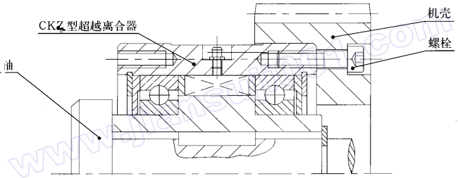 CKZ型為有軸承支撐的楔塊超越離合器。適用于極限轉(zhuǎn)速為600~1500r/min,常用公稱轉(zhuǎn)矩為:180~8000N·m,常用于包裝機、起重運輸機械、冶金機械、礦山機械、石油機械、化工機械、水泥機械、電站等,亦稱逆止器。此型號主要用于逆轉(zhuǎn)及雙動力源的慢速啟動裝置。